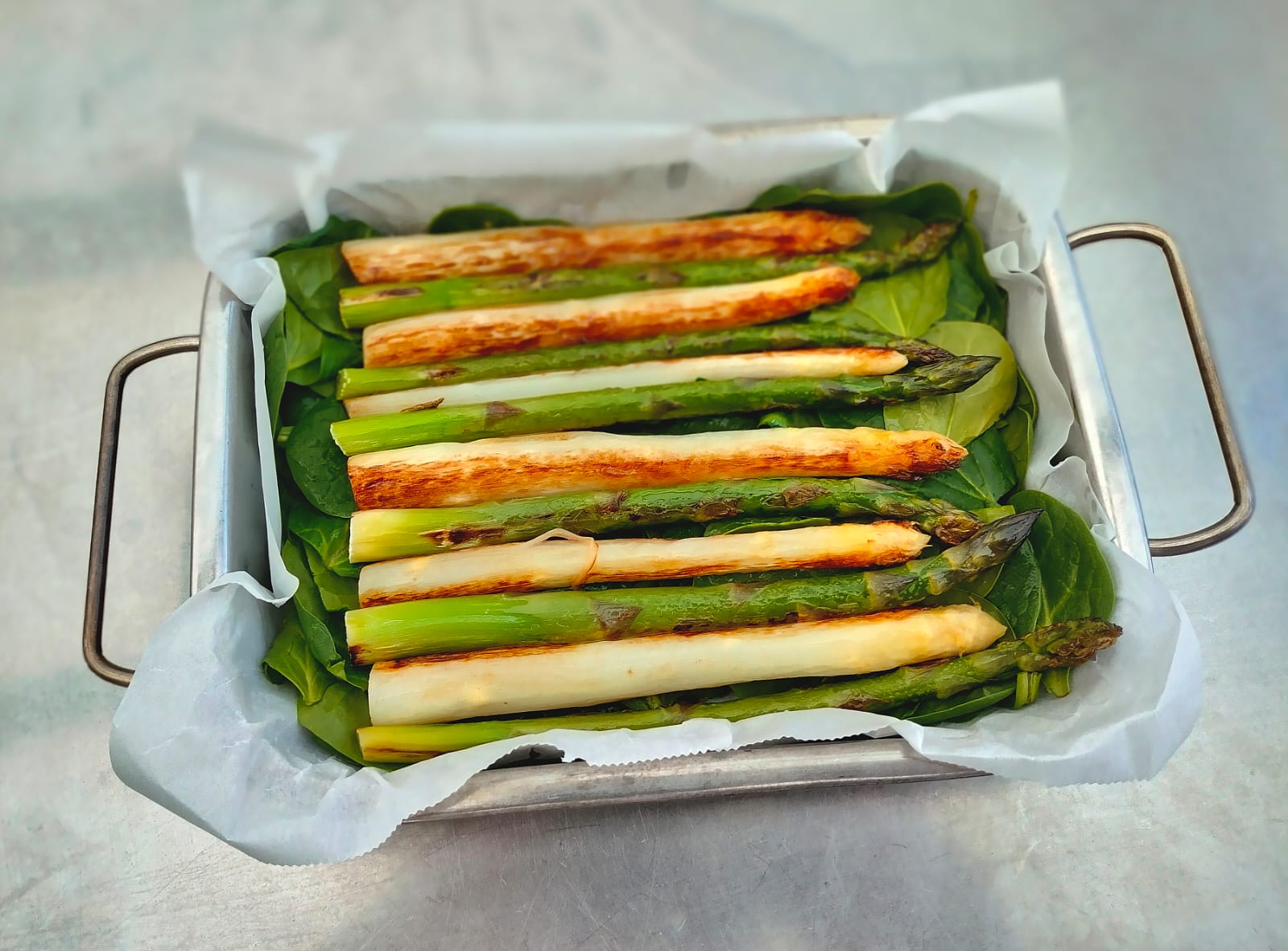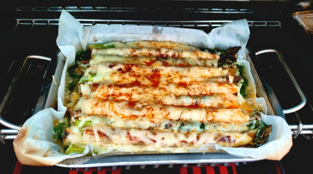 Spargel grün-weiß mit Bergkäse überbacken