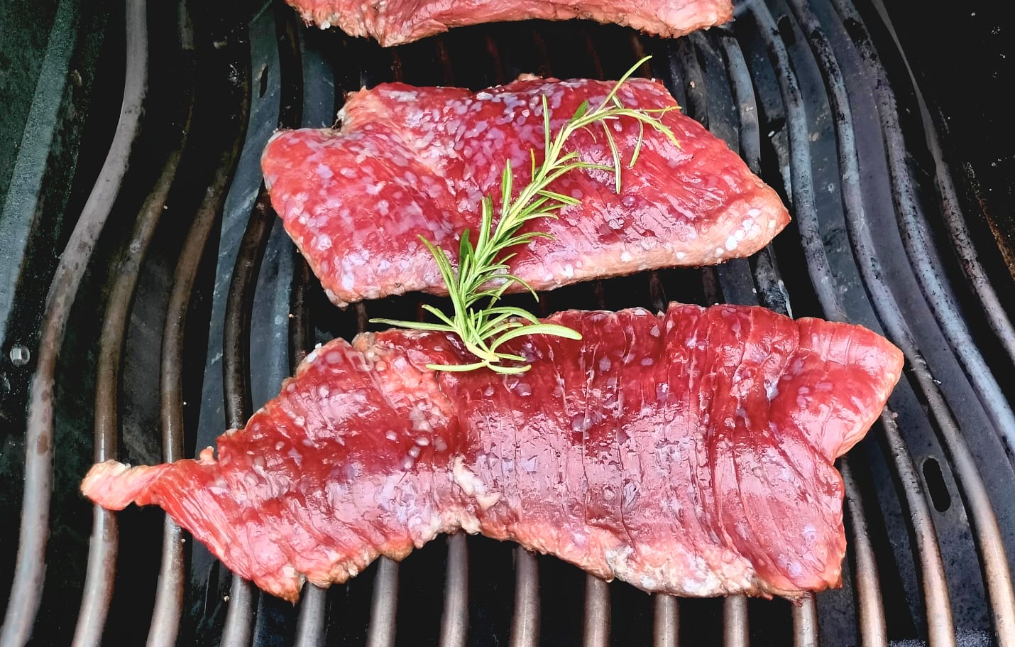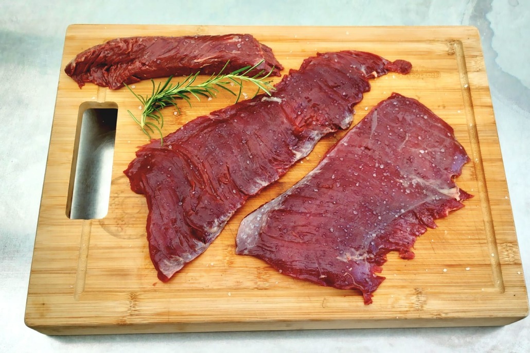 Die Ruhephase ist beim Flap-Steak besonders wichtig, da die langen Fasern sehr viel Wasser binden. Sollte man das Steak jetzt direkt aufschneiden, würde sehr viel Flüssigkeit auslaufen. Da der Saft aber im Steak bleiben soll, ist es wichtig dem Steak ein paar Minuten zur Entspannung zu geben. Dann wird das Steak quer zur Faser in dünne Scheiben geschnitten und mit dem Meersalz und ggf. etwas gepfeffert serviert.
