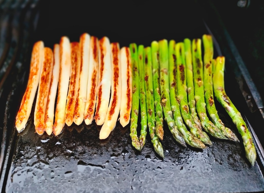 Den Grill auf ca. 180 °C anheizen und mit einer Plancha versehen, alternativ mit einer Pfanne arbeiten. Etwas Butterschmalz auf die heiße Grillplatte geben. Den weißen und den grünen Spargel kurz rundherum angrillen.